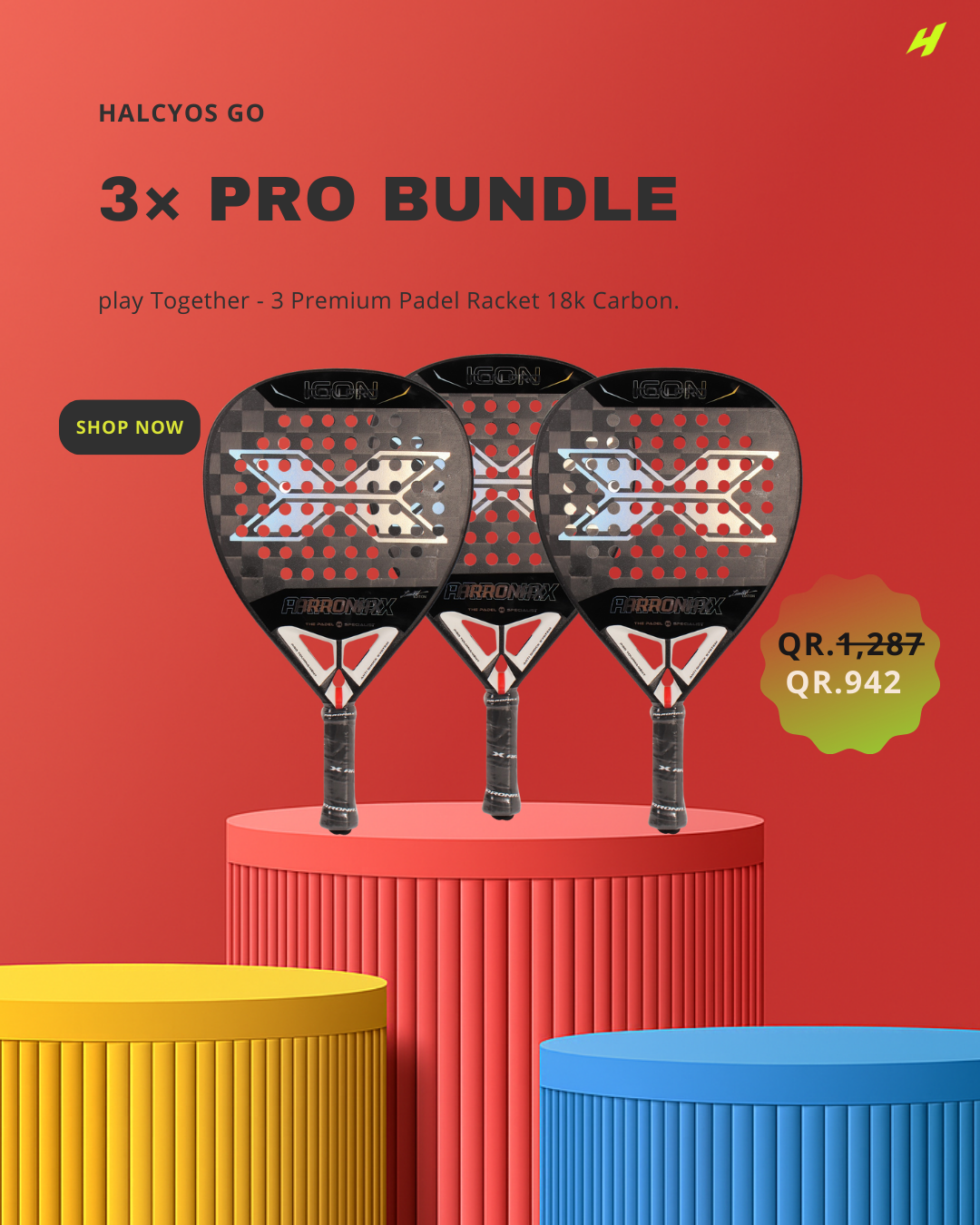 Padel rackets, padel balls, starter packs, pro rackets, Qatar padel equipment, Halcyos GO Doha.
